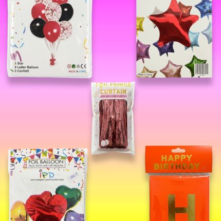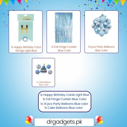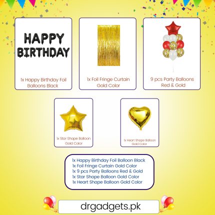 - “Happy Birthday” Printed Balloons: Assorted multicolor latex balloons printed with the “HAPPY BIRTHDAY” message (Blue, Yellow, Green, Pink, Glittery White).
