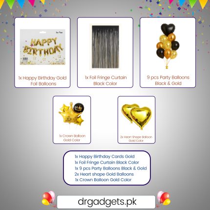 - Royal Balloon Set: A large gold foil crown balloon, two gold foil star balloons, and one round black “Happy Birthday” foil balloon (from original image 5).