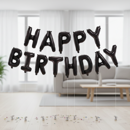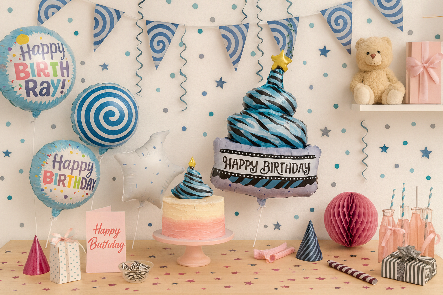 Arrange the Set – Place the large cake-shaped balloon at the center and balance the swirls and “Happy Birthday” balloons on each side.